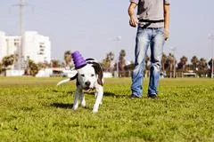 Stock Photo of a pitbull dog running after its chew toy with its owner standing close by. | 240 | 160 | |
