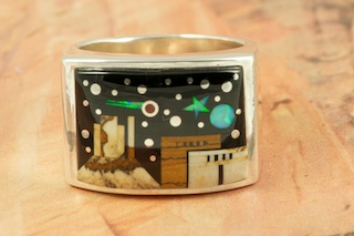 0.32916 | 4,283,801,082,866,448,000 | 0.169639 | 0.000013 | This Ring is a work of art! Beautiful Starry Night in the Pueblo Design with a view of Monument Valley. Featuring Picture Jasper and Black Jade inlaid in Sterling Silver Ring. Beautiful Fire and Ice Lab Opal Moon and Shooting Star! Designed by Navajo Artist Calvin Begay. Signed by the artist. | 0172363345 | success | null | 320 | 213 | 320 | 213 | {"Image PhotometricInterpretation": "32803", "Image Make": "NIKON CORPORATION", "Image Model": "NIKON D90", "Image Orientation": "Horizontal (normal)", "Image XResolution": "72", "Image YResolution": "72", "Image ResolutionUnit": "Pixels/Inch", "Image Software": "Aperture 3.5", "Image DateTime": "2013:11:15 03:12:29", "Image ExifOffset": "212", "EXIF ExposureTime": "10/13", "EXIF FNumber": "22", "EXIF ExposureProgram": "Manual", "EXIF ISOSpeedRatings": "250", "EXIF DateTimeOriginal": "2013:11:15 03:12:29", "EXIF DateTimeDigitized": "2013:11:15 03:12:29", "EXIF ExposureBiasValue": "2", "EXIF MaxApertureValue": "41/10", "EXIF MeteringMode": "Spot", "EXIF LightSource": "Unknown", "EXIF Flash": "Flash did not fire", "EXIF FocalLength": "85", "EXIF SubSecTime": "00", "EXIF SubSecTimeOriginal": "00", "EXIF SubSecTimeDigitized": "00", "EXIF ColorSpace": "sRGB", "EXIF ExifImageWidth": "320", "EXIF ExifImageLength": "213", "EXIF SensingMethod": "One-chip color area", "EXIF FileSource": "0", "EXIF CustomRendered": "Normal", "EXIF ExposureMode": "Manual Exposure", "EXIF WhiteBalance": "Manual", "EXIF DigitalZoomRatio": "1", "EXIF FocalLengthIn35mmFilm": "127", "EXIF SceneCaptureType": "Standard", "EXIF GainControl": "None", "EXIF Contrast": "Normal", "EXIF Saturation": "Normal", "EXIF Sharpness": "Soft", "EXIF SubjectDistanceRange": "0"} | 2efed2c3479ab39ecfd32dd2ad9025c4 | |