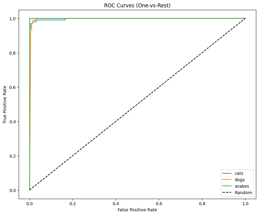 - One-vs-Rest ROC curves are generated per class